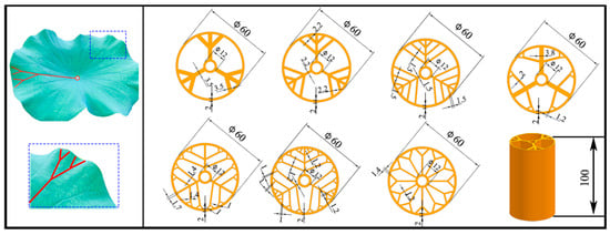 The designed models of biomimetic structures inspired by a lotus leaf (unit: mm).