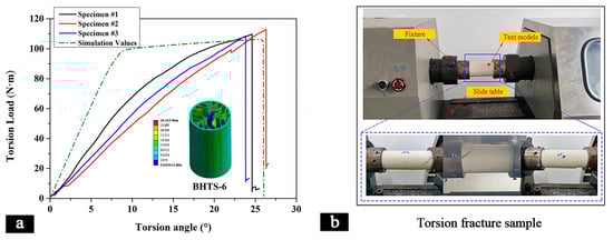 Torsion properties of the different BHTSs. (a) Torsional strength between the experimental and the simulation results for the BHTS-6; (b) torsion properties test.