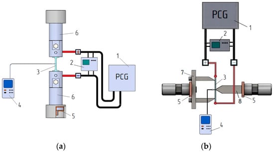 Current supply scheme for tension (a) and bending (b): 1—pulse current generator; 2—oscilloscope; 3—sample; 4—thermocouple; 5—insulation; 6—clamps of the testing machine; 7—matrix; 8—punch.