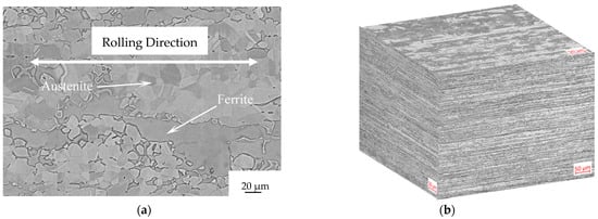 The fragmentation of austenitic grains is a result of the final pass during the rolling process, which is carried out at a low temperature. After the solution treatment, the austenite grains exhibit annealing twins due to their low stacking fault energy. Figure 3b shows an optical micrograph of the as-received sample along the three main directions: Transverse Direction (TD), Rolling Direction (RD), and Normal Direction (ND). The interphase space between austenite and ferrite grain centers is smaller along the normal direction compared to the rolling direction, attributable to the forming process.