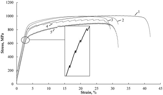 Figure 4 shows the stress–strain curves of samples tested without current (curves 1, 2), with single-current pulses, and with different strain rates (curves 3, 4, 5).