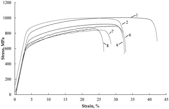 Figure 5 illustrates the stress–strain curves of samples tested under different conditions: without current (curves 1, 2), with various modes of multi-pulse current (curves 6, 7, 8), and with the application of a technical dryer (curve 9).