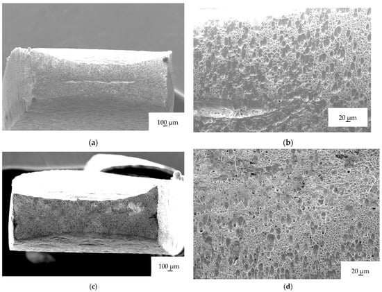 In Figure 7, the fractographs of a sample tested under different conditions are presented. Fractographs A and B correspond to a sample tested with a single pulse at 740 A/mm2, fractographs C and D correspond to a sample tested with multi-pulse current at 45 A/mm2, and fractographs E and F correspond to a sample tested with a technical dryer.