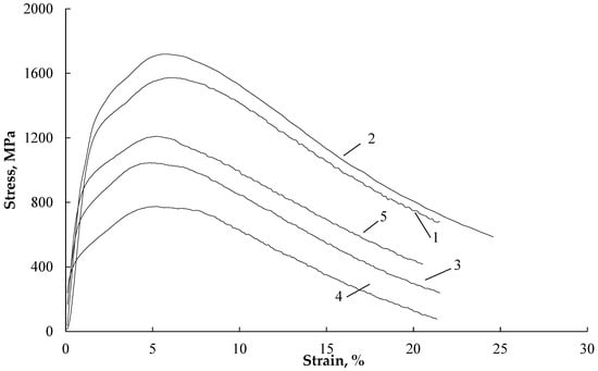 Bending stress–strain curves: 1—without current, 5 mm/min; 2—without current, 200 mm/min; 3—j—20 A/mm2 100 μs, T—100 °C; 5 mm/min; 4—j—30 A/mm2 100 μs, T—220 °C, 5 mm/min; 5—technical dryer T—100 °C, 5 mm/min.