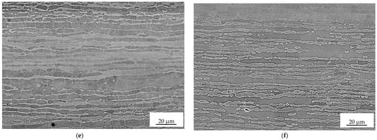 Scanning electron micrograph in backscattered mode of sample deformed in multi-pulse mode with 20 A/mm2 (a,c,e) and sample deformed with technical dryer (b,d,f). Inner radius (a,b), middle (c,d), and outer radius (e,f). Etching solution: “Beraha”.