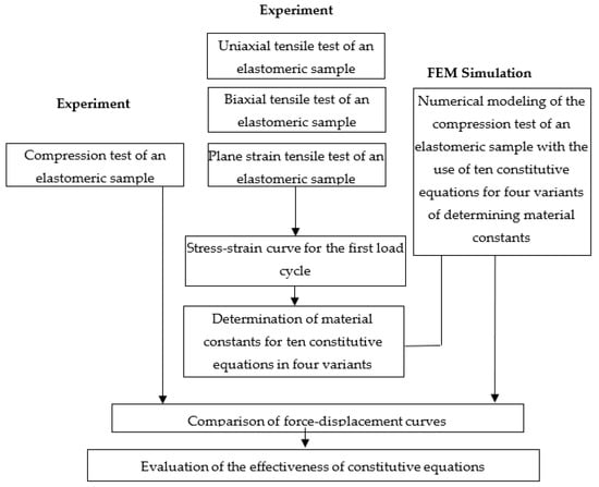The achievement of the research goal required the development of an original research plan, which is schematically presented in Figure 1. The research plan included a part related to experimental research as well as a part related to modeling with the use of nonlinear FEM. The experimental part of the research concerned the material tests necessary to determine the constants in the constitutive equations and the verifying compression test. In order to determine the material constants via four variants, the following tests were carried out: uniaxial tensile test, biaxial tensile test and plane strain tensile test [13,22,23].
