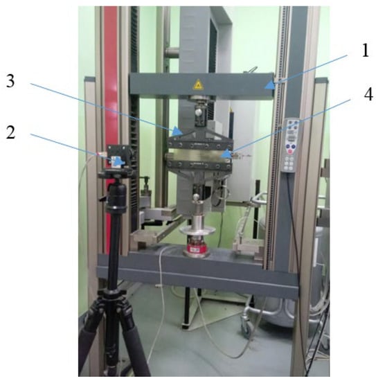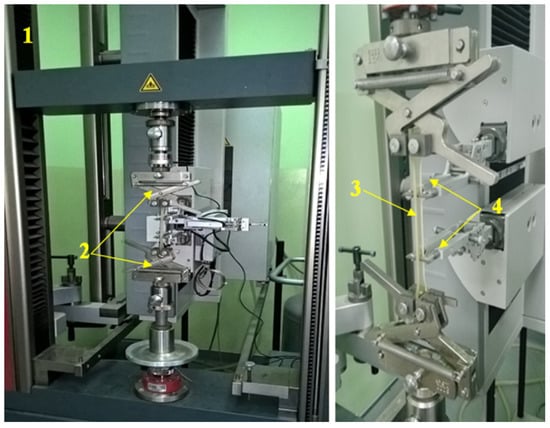 Uniaxial tensile test, view of the sample during the test: 1—testing machine, 2—fixtures, 3—specimen, 4—multiextensometer.