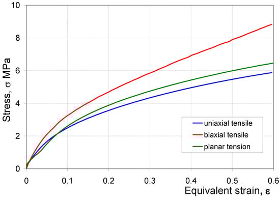 Each of the three samples was subjected to a full cycle of loading and unloading with the constant elongation of the sample Δl = 4.8 mm (measurement base l0 = 16 mm, thickness g0 = 4 mm). In the case of biaxial tensile test, the value of the equivalent stress was calculated as: