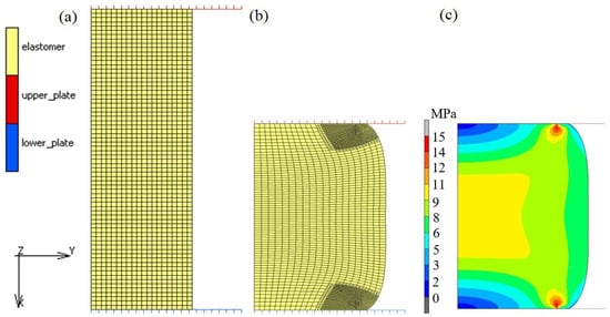 The numerical model of compression of an elastomer cylinder was created on the basis of the physical (experimental) model, i.e., with the same geometrical dimensions and boundary conditions, including contact conditions. A flat model was selected and analyzed with the assumption of the presence of an axially symmetric state of stress. In this case, the use of a two-dimensional model creates more opportunities as to the scope of the research carried out, e.g., due to the lower demand for computing power. The geometric model of the deformable cylinder has been simplified to its longitudinal half-section with the assumption that, in each longitudinal half-section of the deformed cylinder, the state of stress and deformation during its upset will be the same. In other words, the shape of the cylinder will change during the upset, but will remain an axisymmetric figure. The numerical model of compression of an elastomeric cylinder was created at MSC Marc/Mentat with a visible finite element mesh shown in Figure 12a. It consists of a longitudinal half-section of a deformable cylinder and non-deformable tools, i.e., a fixed bottom plate and a movable top plate. A “glue” type of contact was adopted between the elastomeric cylinder and the tool surfaces, which eliminated inaccuracies and errors related to the influence of sliding friction. A glue condition suppresses all relative motions between bodies through tyings or boundary conditions, applying them to all displacement degrees of freedom of the nodes in contact. For elements with nodes that also have rotational degrees of freedom, the rotations may be additionally constrained to provide a moment carrying glue capability. For the case that a connection is made to the face of a solid element, the rotations of the touching node are connected to the translations of the nodes of the contacted patch by a constraint relation based upon the large rotation RBE3 theory.