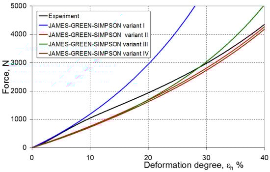 As a result of the numerical simulations for individual models and variants, the compression force as a function of displacement P = f(h) and the compression force as a function of deformation P = f(εh) were obtained. The calculated P = f(εh) curves for individual models and variants for determining the constants in the constitutive equations were compared with the experimental curves and are presented in Figure 13, Figure 14, Figure 15, Figure 16, Figure 17, Figure 18, Figure 19, Figure 20, Figure 21 and Figure 22.