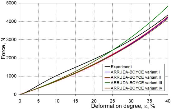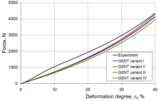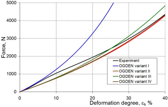 The constants were determined in the uniaxial tensile test. The fit of the Ogden and Yeoh models for small and large deformations with the data obtained from the uniaxial tensile test turned out to be better compared to the Neo-Hookean and Mooney–Rivlin models, which showed low accuracy. In the works [8,9] using three tests: uniaxial tensile, pure shear test and the equibiaxial extension test, it was shown that the Arruda–Boyce model for large deformations provides accurate data over the entire strain range for all stress states. The Monney–Rivlin model is not applicable to large deformations. The Gent model also shows good accuracy of results in pure shear, uniaxial tensile, uniaxial compression and flat compression tests.