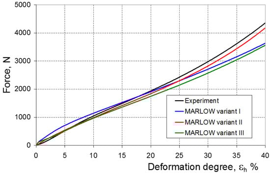 However, using variant I, which solely relied on the uniaxial tensile test, proved to be a more practical solution in engineering practice. The effectiveness of this approach depended on the constitutive equation used, and only a few models achieved a high convergence with the experimental data. Model 10 (Marlow) was again the best model in this variant, with a convergence of −5.5%.