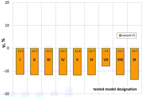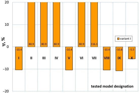 Figure 23, Figure 24, Figure 25 and Figure 26 show the calculated values of the ψ indicator for the investigated constitutive equations and individual variants for determining the material constants in these equations. Analyzing variant I, in which the material constants were determined only on the basis of the uniaxial tensile test, it can be seen that the convergence of the numerical modeling results and the experimental results largely depends on the model used (Figure 23). In this case, five of the tested models showed a very large overestimation of the results. In the case of models 2, 3, 4 and 6, ψ = 80.9%, while for model 7 it was the highest and amounted to approximately ψ = 116%. For the remaining models, an underestimation of the results was observed. Model 10 was the best in variant I, which showed the greatest convergence of the results with the experiment, with a slight underestimation (ψ = −5.5%). The analysis of the ψ indicator in variant II, in which the material constants were determined only on the basis of the biaxial tensile test, showed that the convergence of the results with the experiment to a small extent depends on the model used, while all the tested models showed underestimation of the results (Figure 24). In the case of six models (1−6), the same numerical value of the indicator ψ (ψ = −9.2%) was observed. In the case of model 7, this value was very similar and amounted to ψ = −9.0%. Model 8, for which ψ = −9.5%, showed a slightly greater discrepancy in the results. The largest discrepancy in this comparison (ψ = −12.9%) was demonstrated by model 9, and the smallest by model 10, for which ψ = −4.4%. On the other hand, on the basis of the analysis of the ψ value in variant III, in which the material constants were determined only on the basis of the plane strain tensile test, it can be concluded that the obtained convergence of the results with the experiment also depends on the model used. In this variant (Figure 25), two models showed overestimation of the results, i.e., model 3 (ψ = 12.6%) and model 4 (ψ = 9.5%). The greatest underestimation was shown by model 9 (ψ = −18.1%) and model 1 and model 5 (ψ = −17.4%). Model 2 (ψ = −8.0%) was much better. One can get the impression that the models 6 (ψ = −2.4%), 7 and 8, for which the coefficient ψ was 0.1% fared best in this comparison. It should be noted, however, that in the case of the latter models, such a low ψ indicator results from the specific course of the calculated force–deformation curve, which to some extent lies below the experimental curve (is underestimated), and to some extent lies above the experimental characteristics (is overestimated). Such curves are visible in Figure 18, Figure 19 and Figure 20, where the calculated forces (green line) intersect with the experimental forces (black line). It should be emphasized that, in such cases, the low value of ψ does not mean that the calculated curve and the experimental curve are almost completely convergent, but it is a result of the fact that these forces perform almost the same work. For this reason, in a few cases in which the calculated and experimental curves intersect (in such a way that there are similarly sized underestimated and overestimated areas), the indicator ψ expressed by Equation (25) is not reliable. Similarly to variant II (Figure 24), an analysis of ψ in variant IV, in which the constants in the constitutive equations were determined on the basis of three tests, showed that the convergence of the results with the experiment to a small extent depends on the model used, while all the tested models showed an underestimation of the results (Figure 26). Model 10 is not included in this comparison because its application is not possible on the basis of the results of several material tests at the same time, but only on the basis of the results of one selected material test. Among the nine tested models in variant IV, the highest convergence with the experiment was achieved by model 8 (ψ = −7.9%). Model 9 (ψ = −7.9%) turned out to be the least accurate in this comparison. The remaining seven models 1–6 and 8 fell within the range of ψ = (−11.7 to −11.5)%.