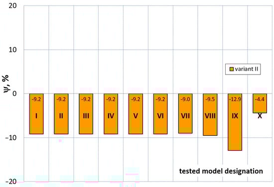 Distribution of the Ψ indicator for the tested models (1–10) using variant II for determining the material constants.