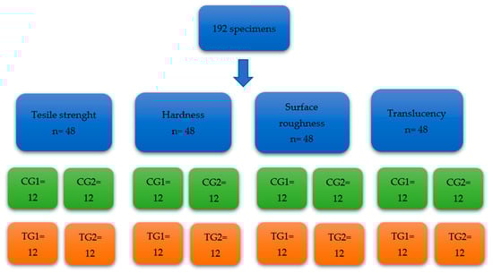 In this in vitro study, twenty-two unused Invisalign aligners (Santa Clara, CA, USA) were used to prepare 144 specimens to test four physical properties: tensile strength, hardness, surface roughness, and translucency. To test each physical property, the specimens were allocated into four groups (Figure 1): a testing group at baseline (TG1, n= 12), a testing group after 2 weeks of dental bleaching (TG2, n = 12), a control group at baseline (CG1, n = 12), and a control group after 2 weeks of immersion in distilled water (CG2, n = 12). Specimens in CG1 and TG1 were immediately tested, while specimens in CG2 were stored in an incubator in distilled water at 37 °C for 2 weeks to simulate oral conditions. Next, specimens in TG2 were bleached using 10% carbamide peroxide (Opalescence PF 10%, Ultradent Products, New York City, NY, USA), which was applied on the internal surfaces of the specimens for 8 h a day at 37 °C, then wiped off; the specimens were kept in distilled water at mouth temperature in the incubator for 16 h. This process was repeated every day for 2 weeks before the specimens in TG2 were tested. This means that the 10% carbamide peroxide bleaching material was applied on the Invisalign specimens for a total of 112 h (8 h/day × 14 days) in TG2. The sample size was calculated according to other studies [19,20,21].