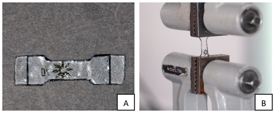 (A) A dumbbell-shaped specimen ready to be tested for tensile strength; note the extra length of the material to facilitate holding the specimen during the testing. (B) The dumbbell-shaped specimen in place ready for tensile strength testing.