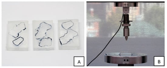 Twelve unused Invisalign aligners (Santa Clara, CA, USA) were used to prepare 48 dumbbell-shaped specimens to test for tensile strength. The aligners were first heated using a Profom Vaccum forming machine (Profome Vacuum Former Machine III, Keystone, Burlington, NJ, USA), allowing for easier manipulation and flattening of the aligners. The aligners were then cut into four parts, and each part was used to create one sample, so four samples were prepared from each aligner. A resin jig printed (Prusa, MK3S+, Czech) with a dumbbell shape was used to mark the dumbbell shape on the aligner before cutting the four aligner parts into four identical specimens (Figure 2A). A universal testing machine (Instron 3369; Instron, Norwood, MA, USA) was used with a 500 N load cell to evaluate the point of failure of the specimens after the application of tensile force at a speed of 1 mm/min (Figure 2B).