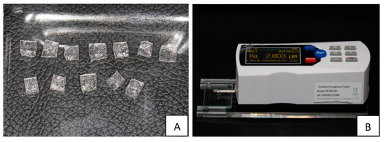 Six mandibular aligners were used to prepare 24 square-shaped specimens (5 mm × 5 mm) cut from the lingual surfaces of the central and lateral incisors (Figure 4A). No attempts were made to heat the aligners for flattening in order to preserve the surface imprints for testing; instead, nearly flat areas were cut and tested directly for surface roughness using a surface roughness tester (Figure 4B). The specimens were also divided into four groups as mentioned in Section 2.1: CG1, CG2, TG1, and TG2. The only difference was that the same specimens were used to test surface roughness in the control group at baseline (CG1) and after 2 weeks of being stored in distilled water at 37 °C (CG2). Likewise, the same applied to the testing group, in which the same specimens were used to test the surface roughness at baseline (TG1) and after 2 weeks of bleaching using 10% carbamide peroxide (TG2). It is worth mentioning that the internal surfaces of the control and the testing groups where the patient would apply the bleaching agents were tested. Furthermore, the external surfaces of the specimens in the four groups were tested at baseline and after 2 weeks to check for any change that might affect the plaque affinity to Invisalign. Surface roughness was measured in Ra (roughness average) units, which is the most common unit used to calculate the surface roughness by measuring the average surface heights and depths across the surface.