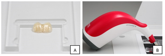 (A) Composite material (Filtek Supreme, 3M ESPE, MN, USA) was used to make a two-central-incisor mould, which was held against the specimen during translucency testing on a white and a black background. (B) Vita Easyshade*V was used to test the translucency; each specimen was tested twice: once with a white background and the other with a black background.