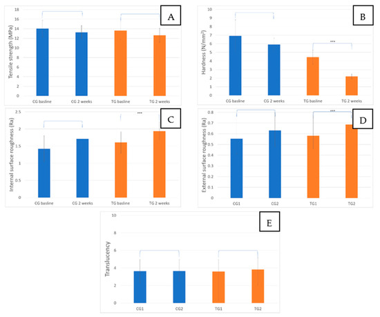 (A) Tensile strength of groups CG1, CG2, TG1, and TG2. No statistically significant difference was found between all groups. (B) Hardness of groups CG1, CG2, TG1, and TG2. A significant difference was found when comparing TG2 to TG1 and TG2 to CG2. (C) Internal surface roughness of groups CG1, CG2, TG1, and TG2. The only statistically significant difference (increase in surface roughness) was found when comparing TG2 to TG1. (D) External surface roughness of groups CG1, CG2, TG1, and TG2. A significant difference (increase) was found between TG2 and TG1. (E) Translucency values of groups CG1, CG2, TG1, and TG2. No statistically significant difference was found between all groups. Error bars represents standard deviation. *** represents p-value < 0.001.