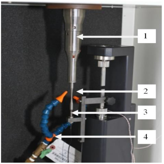 Pictorial view of the test system Shimadzu USF-2000: 1—Horn, 2—sample, 3—displacement sensor, 4—cooling system.