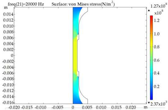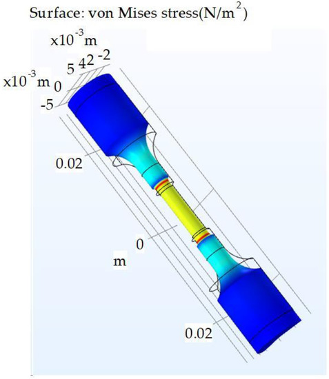 The testing machine was not capable of directly measuring the stress distribution while in the state of vibrations. The stress value was carried out by controlling the displacements (vibrations) of the end face of the sample using the analytical formulas described in [26]. Using the COMSOL Multiphysics 6.0 software mathematical package, the critical stress values in the samples under static loading were determined by considering their geometry (Figure 5 and Figure 6). Table 5 lists the stress values for the given displacement.