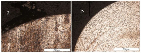 After testing for fatigue life, micro-sections were cut from the samples which were prepared in several stages: (i) the samples were first poured into Bakelite (BAKELITE SYNTHETICS Headquarters, Atlanta, GA, USA) and pressed in an automatic mounting press; (ii) grinding was performed on sandpaper with a grain size of p240 to p1500 on a Top Tech Plato grinding machine (Top tech machines co, Taichung City, Taiwan); (iii) after polishing, the sample was washed with water, degreased with a swab dipped in ethanol, and dried with filter paper; (iv) the micro-section was etched with Novikov’s solution to examine the microstructure of the sample.
