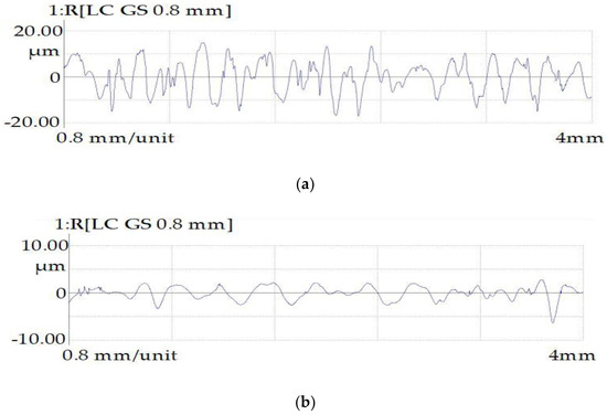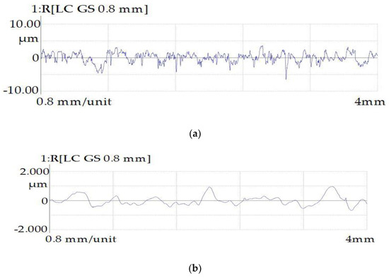 Surface profilograms of samples obtained by the finishing EDM method: (a) before PeP and (b) after PeP.