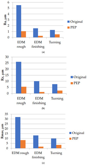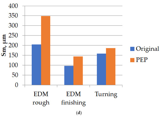 The profiles of the surfaces of the samples obtained after rough EDM before and after PeP are shown in Figure 11.