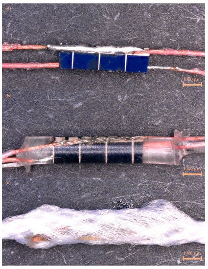 The solar electronic yarns used in this work utilized a revised design to those employed in earlier articles [1,27] and shared similarities to a design presented by [28]. The choice for the revised design (compared to [1]) considered a handful of factors: The earlier use of non-insulated wires imposed restrictions on the spacing between solar cells (as larger gaps would allow the wires to potentially touch, creating a short circuit) and could result in failure in the presence of conductive liquids (such as sweat [25]). Another consideration was the solar cell size. By using insulated wires, the solar cells could be positioned further apart, so longer cells could be considered, and by using relatively large gaps between the cells, the final textile structure would still be deformable. It was desirable to minimize the number of solar cells used, to both simplify the construction of the final panel and minimize the potential points of failure; therefore, longer cells were used in this work (~5 mm long as opposed to ~3 mm long).