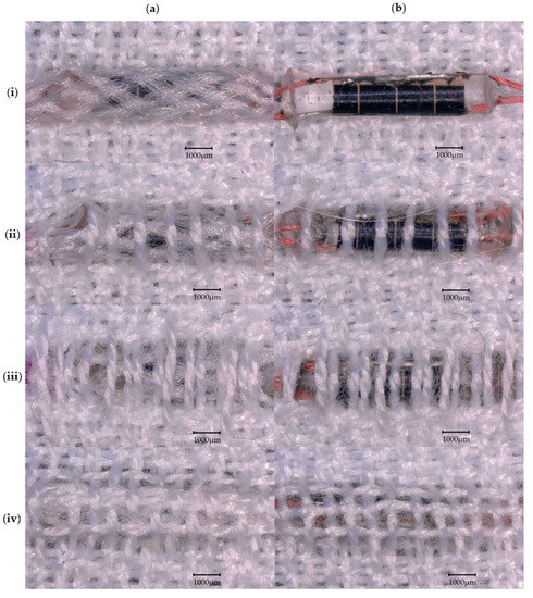 Microscope images (30× magnification) of the four different designs of textile swatches incorporating the solar E-yarns and solar E-filaments explored in this work. A double cloth woven structure was used with different quantities of yarns covering the solar cell element of the solar E-filaments/solar E-yarns: (i) no covering; (ii) four covering warp yarns; (iii) eight covering warp yarns; and (iv) twelve covering warp yarns/fully covered. Both solar E-filaments and solar E-yarns were employed: (a) solar E-yarns and (b) solar E-filaments (no braided sheath). The scale bars represent 1000 µm.