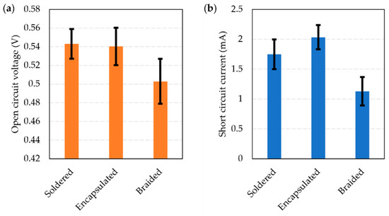 A set of 19 solar E-yarns (containing single solar cells) were prepared. Each solar E-yarn was tested at each stage of the manufacturing process to characterize their performance at each of these stages. While similar characterizations have been conducted in earlier work [1,28], this had used a different solar cell and slightly different solar E-yarn architecture, so a full understanding of the performance of the solar E-yarns used in this work was sought for completeness. Open circuit voltage (Figure 4a) and short circuit current (Figure 4b) are shown below.
