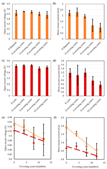 ) only as a function of covering yarns (re-using datapoints from a to d). (e) Open circuit voltage (VOC). (f) Short circuit current (ISC). The data fittings are provided below (in Table 1). For the data presented in this figure, each datapoint presents an average taken from four samples (except for when 12 covering yarns were employed where 8 E-filament samples were tested and 6 E-yarns samples where tested, or where the E-filaments or E-yarns were tested where 20 and 14 samples were tested, respectively).