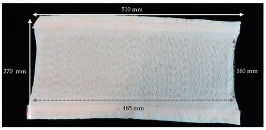 For the large woven textile solar panel, 150 solar E-filaments were produced, each containing eight solar cells. These solar E-filaments were networked in series into modules incorporating 15 solar E-filaments each; this was done to increase the voltage output of the final panel, with a targeted voltage exceeding 5 V (the input for many portable devices). The module design is shown in Figure 3. Eight modules were produced within the textile and were networked together in parallel. The large area woven textile solar panel was constructed with solar E-filaments and a twelve covering yarn/fully covered double cloth woven structure. The rationale for this design choice is discussed in Section 3.3.