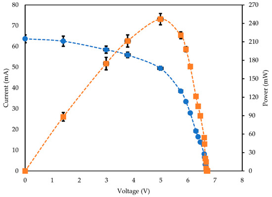 The panel had normal textile properties and was highly deformable (see Figure A3). The completed panel was subsequently tested in direct sunlight for five different lighting conditions. Figure 7 shows characteristic current–voltage and power–voltage curves when the panel was tested under 82,000 lux lighting conditions. Full raw datasets for all of the lighting conditions (27,800 lux, 35,000 lux, 58,500 lux, 82,000 lux, and 99,000 lux) which the panel was tested under are available in the data archive associated with this article.