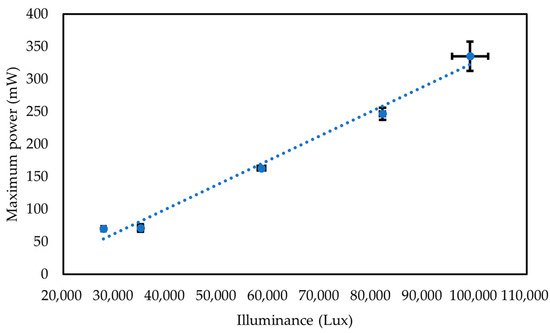 As expected, the maximum achievable power was linearly related (R2 = 0.9868) to the illumination level with the relationship shown in Equation (1).