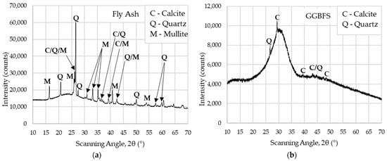 XRD analysis of precursor’s composition: (a) FA, (b) GGBFS.