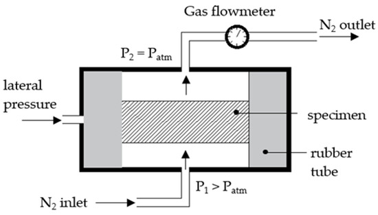 The Cembureau method remains a widely used technique for measuring gas permeability [34]. The pressure values of the inlet (P1) and outlet (P2) are kept constant during the measurement to obtain accurate results for gas permeability. The measurement is based on a stabilized and permanent gas flow. The measurement also accounts for the atmospheric pressure and temperature, which can potentially impact the results, to accurately estimate the permeability. Standard inlet pressure values are between 1 bar (0.1 MPa) and 5 bar (0.5 MPa). The rubber gum surrounding the specimen is subjected to a lateral pressure of 8 bars to prevent gas from leaking around the sample. Figure 2 illustrates the setup of the Cembureau method.