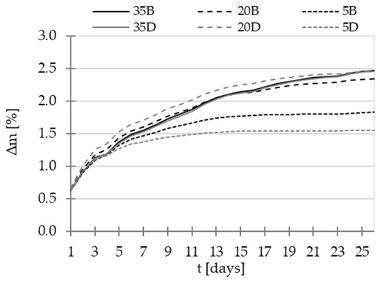 Following the first measurement step conducted at the natural state of the material (referred to as 20 °C, based on the data at 360 days, as presented in Figure 3), subsequent stages of the study were carried out. These stages involved subjecting the samples to drying processes at 40 °C, 80 °C, and finally 105 °C. For each step of temperature, the drying process was carried out to reach a stable mass of samples (criteria of relative mass loss ∆m inferior to 0.1% during 24 h). The example of mass stabilization for drying at 40 °C is presented in Figure 4.