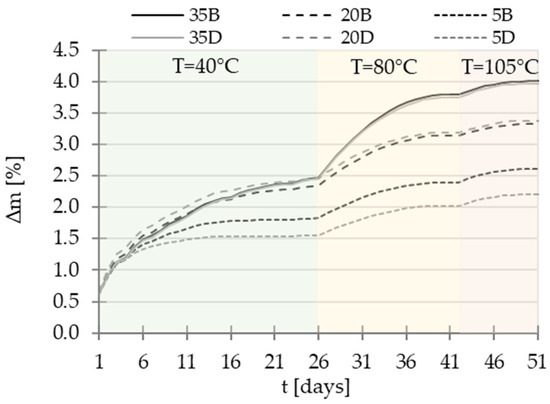 To cool down the specimens, they were placed in a desiccator filled with hydrophobic pellets to minimize moisture presence. After 24 h of cooling, the mass of each material was checked, and then the permeability test was conducted. Immediately after the measurements, the specimens were placed in a dryer with the next level of temperature, and the procedure was repeated. All tests were performed on the same specimens to minimize the impact of heterogeneity of concretes. The complete drying process and the changes in the mass of the specimens are depicted in Figure 5.