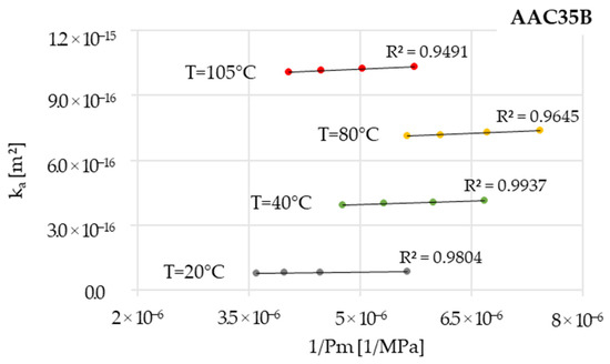 Apparent permeabilities in the function of inversed mean pressure show that permeability increases with temperature and follows Klinkenberg’s law (see Figure 6 for AAC35B as an example). The slopes’ increase with higher temperatures means that pore fineness is increasing, probably because of the creation of newly accessible fine pores during drying and cooling. Simultaneously, an opposing effect can occur due to the expansion of existing pores that are already accessible, which is caused by the evaporation of water from their internal surfaces [37,38].