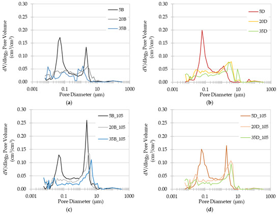 Pore diameter distribution of tested materials: (a) basalt concretes at a temperature of 20 °C; (b) dolomite concretes at a temperature of 20 °C; (c) basalt concretes at a temperature of 105 °C; (d) dolomite concretes at a temperature of 105 °C.