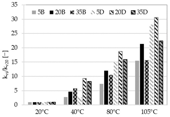 The following analysis is focused on the intrinsic gas permeability values and their correlation with specific drying temperatures. The ratio proposed for further analysis is ki/ky, where i and y refer to drying temperatures. Values of ki/k20 are shown in Figure 8.
