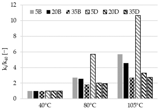 The impact of the drying process over 40 °C is related to complex physical and chemical changes and will be discussed below. Values of the ratio ki/k40 are shown in Figure 9.