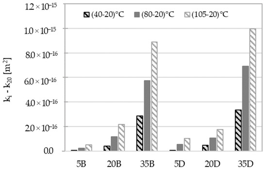 The permeability values for concrete with dolomite aggregate increased more significantly than for those with basalt aggregate for almost all of the tested temperatures (40 °C, 80 °C, and 105 °C). This may be due to physical changes in the microstructure of the zone between the paste and the aggregate, as the latter are not intrinsically affected at these temperatures. Figure 8 clearly shows that the drying process at 40 °C had a greater impact on the intrinsic gas permeability values of AAC35B and AAC35D compared to AAC5B and AAC5D. For AAC35B, the value of permeability increased from 6.07 × 10−17 m2 to 34.8 × 10−17 m2 between 20 °C and 40 °C, respectively (k40/k20 ratio equal to 5.74). For AAC35D, permeability for these temperatures reached 4.65 × 10−17 m2 and 38.2 × 10−17 m2, which makes a k40/k20 ratio equal to 8.22. However, low-slag-content materials showed a lower sensitivity when heated to the temperature of 40 °C. The value of the k40/k20 ratio for AAC5B and AAC5D were 2.71 and 2.64, respectively.