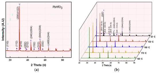 In an effort to clarify the structural nature and AFE properties of lead hafnate, high-quality and dense PbHfO3 ceramics were prepared in pure perovskite phase using the solid-state synthesis method and a conventional sintering process with special caution to preserve the stoichiometry. Detailed structural analysis using the Rietveld refinements confirmed the orthorhombic symmetry with the Pbam space group at room temperature which is in agreement with earlier reports [,]. Temperature-variable structural analysis revealed an orthorhombic Imma symmetry for the intermediate phase of lead hafnate between 150 °C and 185 °C, which agrees with a report by Bosak et al. []. The refined crystal structure of the Imma phase illustrates antiparallel displacement of Pb2+ ions along the [001]cubic direction with the tilting scheme of a0b-b-, which is different from the antiparallel alignment of Pb2+ ions in the Pbam phase at room temperature.