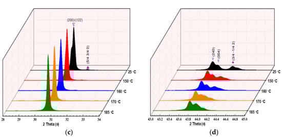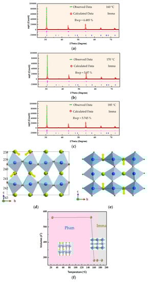 To investigate the abovementioned phase transition, a detailed analysis of the structure of PbHfO3 in the intermediate phase was carried out using the Rietveld refinements of the high-temperature X-ray diffraction data using the GSAS2full 4801 software. Figure 2a–e present the refinement results for the intermediate phase, with comparison of the experimental and calculated XRD patterns, along with the respective space groups and reliability factors. Since no superlattice reflections of the 1/4 (hkl)-type were found in the temperature range of the intermediate phase, the Pbam space group can be excluded, while the Imma space group fits the experimental data most satisfactorily. The assignment of the Imma space group to the intermediate phase of PbHfO3 agrees with a report by Bosak et al. []. The details of the Rietveld refinement results of PbHfO3 at different temperatures within the intermediate phase are given in Table 2. The reliability factors of the weighted patterns (Rwp), the final refinement (wR) and the goodness of fit (GOF) are in the ranges of 3.434–6.485%, 4.926–6.49% and 1.513–2.32%, respectively, indicating good fitting of the selected structural model. At high temperatures, no oxygen octahedral tilting about the a-axis was observed, as opposed to at room temperature. The tilting scheme for the Imma phase is a0b-b-, while at room temperature; the Pbam symmetry shows the a−a−c0 tilting scheme, similar to that in lead zirconate [,,,]. The antiparallel displacement of Pb2+ ions was found to be along the [001]cubic direction in the intermediate phase, as shown in Figure 2e, which is clearly different from the alignment of Pb2+ ions at room temperature, as shown in Figure 2d. This antiparallel dipolar alignment suggests an AFE nature for the intermediate phase. The change in the lattice volume with temperature is presented in Figure 2f. It can be seen that the unit cell volume was drastically decreased upon heating at about 160 °C, as PbHfO3 underwent the transition from the room temperature Pbam phase to the intermediate phase of the Imma space group.