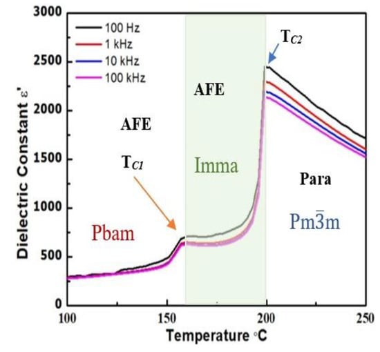 Figure 3 depicts the temperature and frequency dependencies of the dielectric permittivity of an as-sintered ceramic measured at various frequencies upon heating. Two dielectric anomalies can be clearly found at 163 °C (TC1) and 199 °C (TC2), which correspond to the phase transitions from the antiferroelectric orthorhombic Pbam phase to the antiferroelectric orthorhombic Imma phase, and from the antiferroelectric Imma phase to the paraelectric, cubic Pmm phase, respectively.