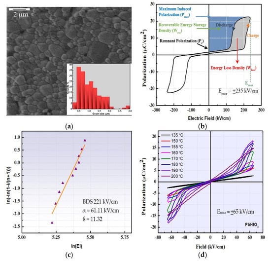 The dielectric breakdown strength (DBS) is one of the most important factors affecting energy-storage performance. It is highly influenced by the density, grain size and microstructure of the ceramics. Dense ceramics with smaller grain size tend to exhibit higher DBS values. Figure 4c presents the Weibull distribution of the DBS for the PbHfO3 ceramics, which can be expressed as [,,,,,]