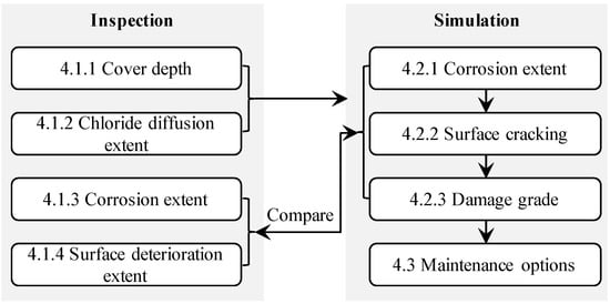 Table 6 shows the comparisons between the in-situ measurements and the simulation results in terms of steel corrosion extent and surface damage grade. It can be concluded from the above analysis that the simulation results are consistent with the in-situ measurements.